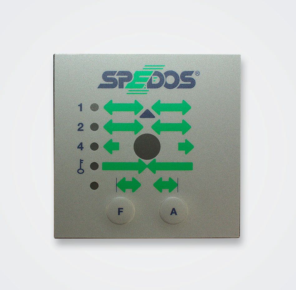 Slouží k volbě provozních režimů automatických dveří posuvných. Nastavení probíhá manuálně pomocí tlačítek F a A. Programový přepínač signalizuje stavy a chyby pohonu automatických dveří.