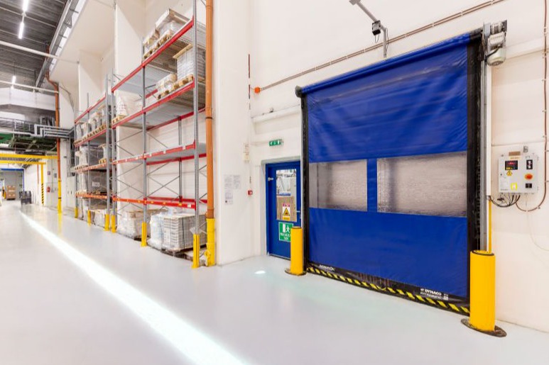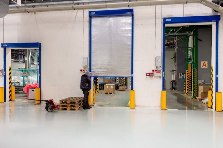 Pro příjem zboží a materiálu byla do vnějšího pláště instalována sekční průmyslová vrata s atypickým těsněním vyrobeným přesně na míru. Pro oddělení jednotlivých provozů byla použita rolovací vrata. Požární úseky s méně frekventovaným průjezdem byly vybaveny protipožárními otočnými dveřmi.