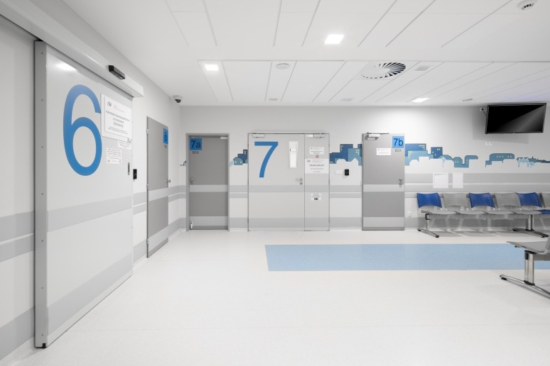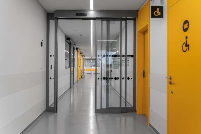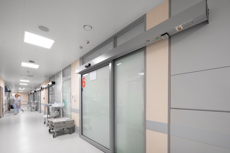 Nemocnice - vstupy na operační sály jsou vybaveny jednokřídlými automatickými dveřmi posuvnými s elektrickým pohonem SP805L a speciálním posuvným křídlem EP určeným do čistých prostor. Dveře se ovládají loketními spínači a jsou vybaveny proskleným okýnkem. Barevné provedení automatických dveří - zelená, modrá, žlutá barva - ladí s okolním prostředím.