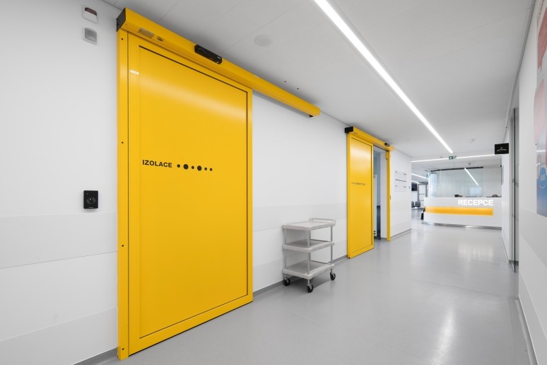 Automatické dveře posuvné jednokřídlé ve speciálním provedení pro čisté prostory operačních sálů, laboratoří apod.. Ve dveřním křídle jsou vestavěny žaluzie, které se ovládají magnetem. Aktivace dveří probíhá pověřeným personálem pomocí loketního spínače. V další části budovy jsou instalovány žluté čtyřkřídlé teleskopické dveře s pohonem SP805T.