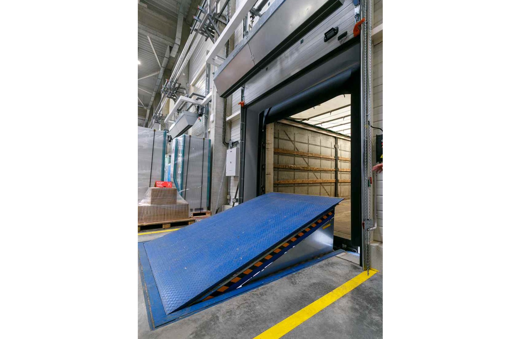 Pro příjem zboží a materiálu byly do vnějšího pláště nainstalovány tři nakládací komplety složené z hydraulického můstku se sklopnou lištou, vratového těsnění VTKS01 a sekčními vraty VM01. Pro minimalizaci škod způsobených špatným nájezdem kamionu byly instalovány nájezdové vedení v pozinkované variantě. Požární úsek je oddělen protipožárními vraty posuvnými v nástřiku modrého odstínu.