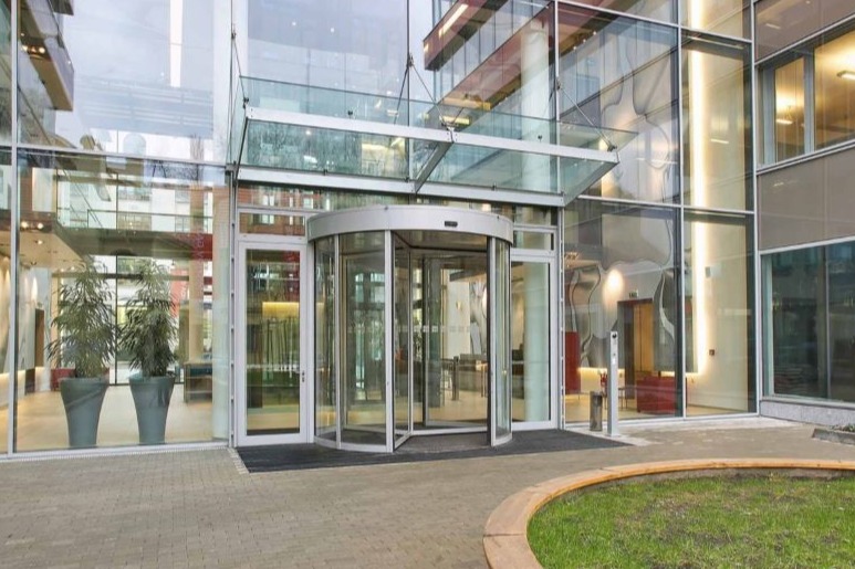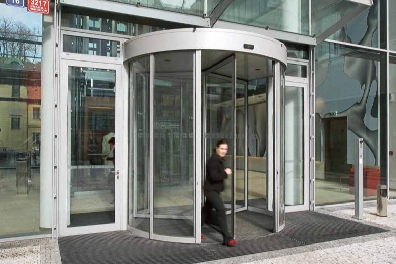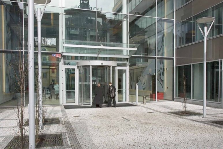 Vstupní hala výškové administrativní budovy zabírá celé přízemí a má dva protilehlé vstupy. Vznik průvanu je velkou hrozbou. Ideálním řešením jsou proto karuselové dveře, které jsou stále zavřeny a přitom průchozí. Z obou stran byl použit model Tourniket, tříkřídlý, pevný, o průměru 2 600 mm. Stropní věnec s pohonem je zapuštěný v podhledu.