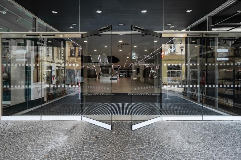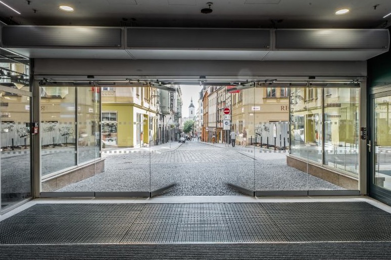 Vstup do obchodního centra. Bezbariérové zádveří je tvořeno automatickými posuvnými dvoukřídlými dveřmi s elektrickými pohony SP806L, které jsou aktivovány kombinovanými radary k zajištění otevírání dveří a bezpečnosti procházejících dle EN16005.