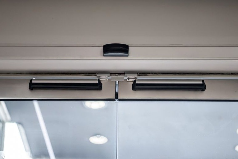 Automatické posuvné dveře dvoukřídlé v prosklené příčce - vstup do provozní části obchodního centra. Dveře jsou stejného provedení jako okolní konstrukce, se kterou splývají. K identifikaci dveří slouží radar nade dveřmi a modré nálepky trojúhelníkového tvaru, naznačující směr pohybu křídel.